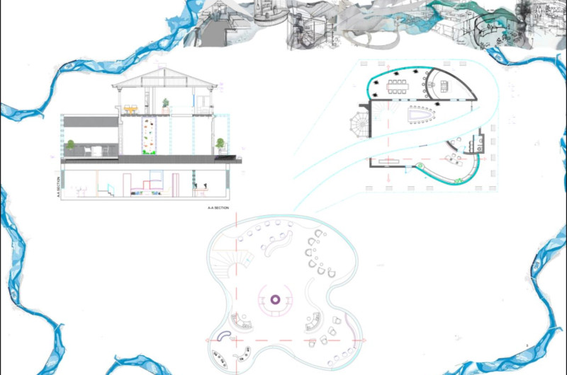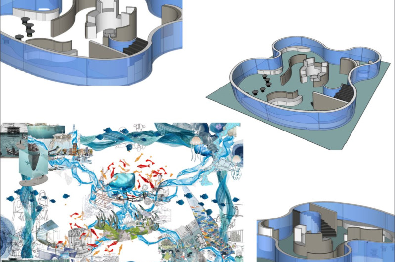 The spatial form is shaped by sea currents and the scale of coastal rock formations. These natural forces generate a continuous, folded geometry that defines the most stable structure in relation to water movement. The resulting fluid boundaries extend through the pier, into the water, and down to the underwater aquarium spaces, creating a seamless relationship between land, surface, and sea.