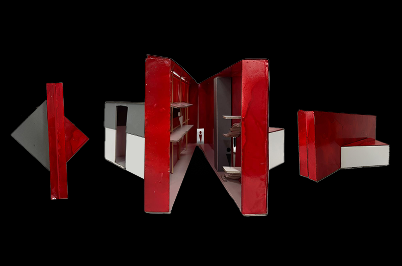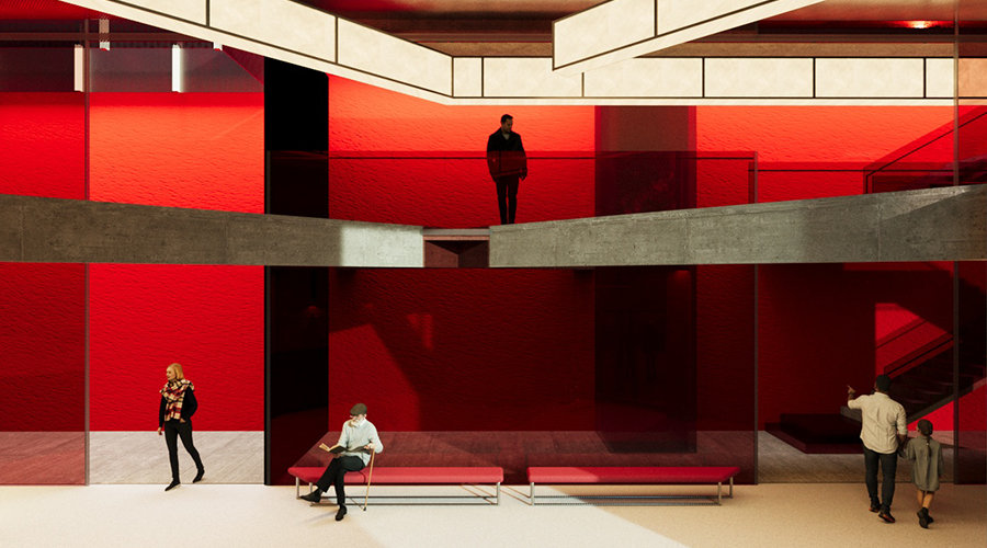 Since the existing Beykoz Kundura Visitor Building is not visually prominent and often goes unnoticed by visitors, the new design was intended to be striking in both color and mass. Based on this approach, a red rectangular volume was inserted diagonally into the existing structure. This intervention allowed the interior to be divided into distinct spatial zones. The plan layout, which is organized into three different sections, is similarly expressed through three varying floor heights.